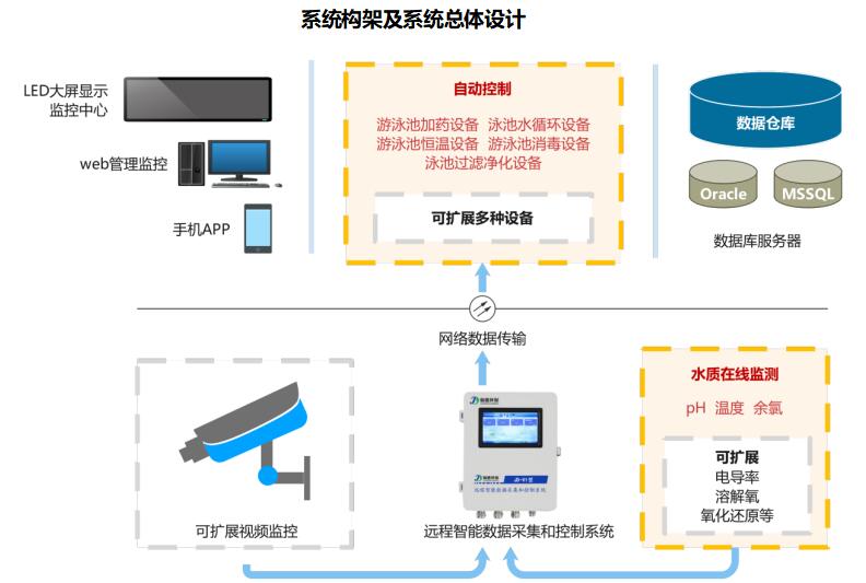 JDYYC-I型泳池水质在线监测系统对游泳池内pH、温度、余氯等参数的采集、存储,并具有向监控中心传送数据以及执行监控中心的指令等功能。本系统采用常规的RS-485、232、无线等数据通信方式,配有专用的游泳池水质监控系统软件,组网方便,可靠性高、成本低、便于维护和对环境进行数据存储和分析,在设备异常情况下能以多种形式的报警通知相应人员,能24小时不间断实时监控记录。该系统可广泛运用于游泳池、水上乐园、人工浴场等领域。